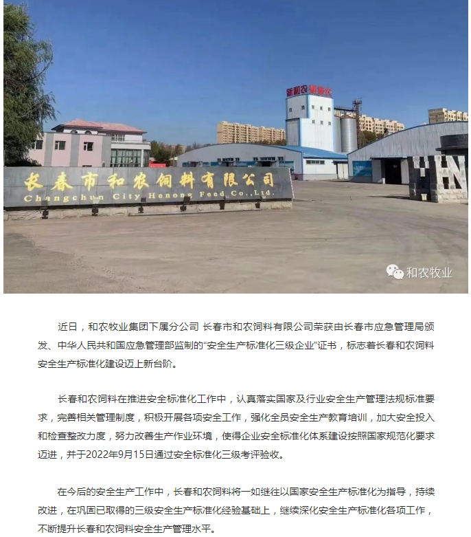 長春市和農(nóng)飼料有限公司榮獲“安全生產(chǎn)標(biāo)準(zhǔn)化三級企業(yè)”證書