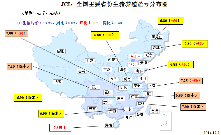 來(lái)自中國(guó)農(nóng)業(yè)部最新發(fā)布的統(tǒng)計(jì)報(bào)告--《2014年11月第2周(總第46周)畜產(chǎn)品、飼料集市價(jià)格》顯示,截至11月12日,全國(guó)生豬市場(chǎng)均價(jià)在14.10元/公斤,仔豬均價(jià)為21.51元/公斤,豬肉均價(jià)為23.19元/公斤,較10月均值分別下跌2.22%、8.19%和1.75%。盡管11月份我國(guó)生豬、仔豬和豬肉(白條肉)市場(chǎng)價(jià)格呈現(xiàn)全面回調(diào)格局,但是由于國(guó)內(nèi)豆粕、玉米包括相關(guān)飼料原料成本近來(lái)明顯回落,生豬價(jià)跌勢(shì)相對(duì)于飼料成本降幅較為溫和,全國(guó)大多數(shù)地區(qū)的養(yǎng)殖戶(hù)(場(chǎng))仍然維持保本或微利狀態(tài)。如前文所述,進(jìn)入12月份我國(guó)生豬市場(chǎng)依然存在需求推動(dòng)型的反彈空間。